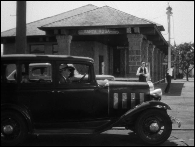Niece Charlie (Wright) drives the family car alongside the Santa Rosa depot; As the family walks the platform, the engineer of NWP #142 is already laying on the smoke. Compare with this studio publicity still of the same location.