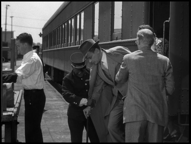Uncle Charlie requires assistance down the steps of the Pullman; The conductor waves a highball after Uncle Charlie and his luggage are deposited on the platform.