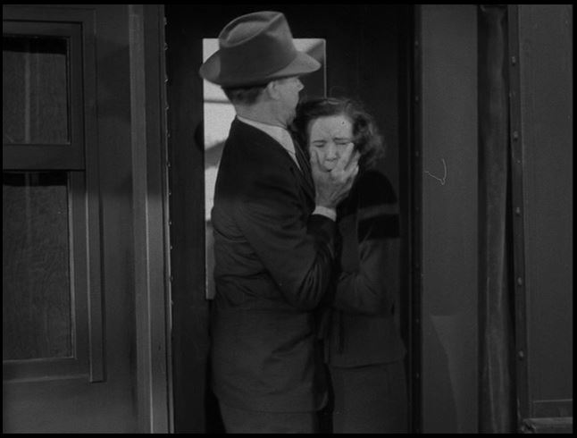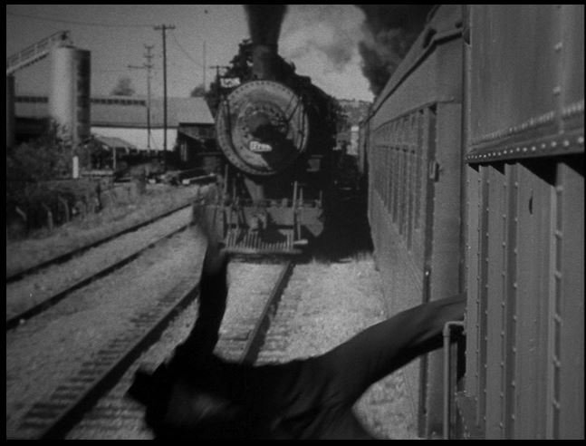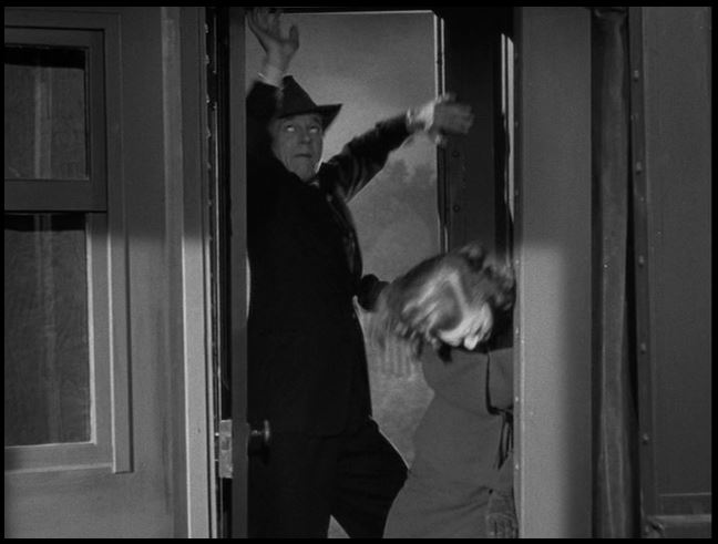 BIG mistake on her part. Uncle Charlie knows she’s onto him and plans to do her some bodily harm as the train starts pulling out of the station. That is a look of sheer terror!
