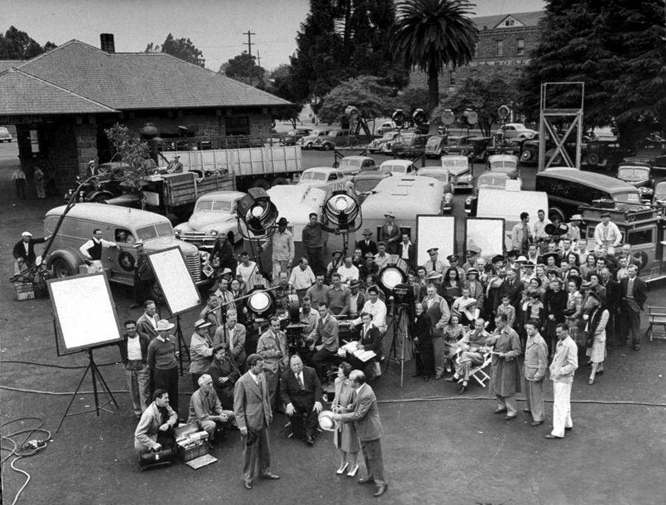 Great movie. Hitchcock was not called the master of suspense for nothing. One more publicity still taken at the Santa Rosa depot. Look at all that gear, cast and crew!