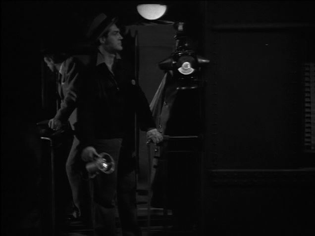 Most of the movie is told in flashback. Here we see Mida talking to a switchman (complete with cool railroad lantern) and we get some good, interior views of the Pullman car set.