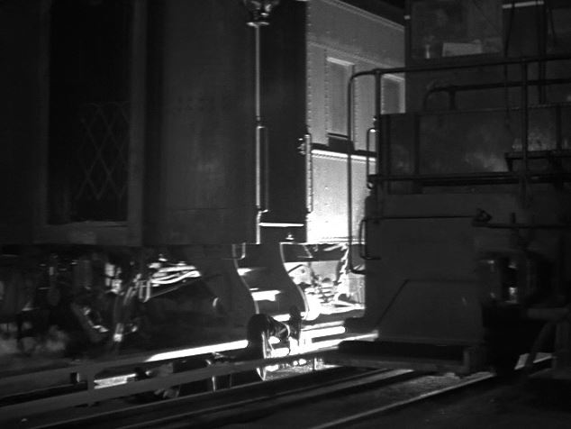 The chase is on. Lots of back-lit, Noir-ish lighting. Turk races between Pullmans with the police in hot pursuit. As Turk hides, we get a quick glimpse of SP switcher #1315. Very interesting window configuration on the coach the switcher is pulling.