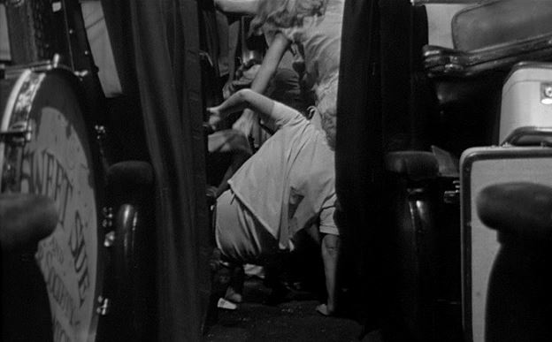 Marilyn fetches a block of ice from somewhere and hands it to Tony. In the second picture, you can just make out, “Sweet Sue and her Society something… (Symphony?)” on the bass drum. I can’t quite make it out. Chopping up the ice for the party in the woman’s restroom, Tony and Marilyn find themselves having a little private drink together.