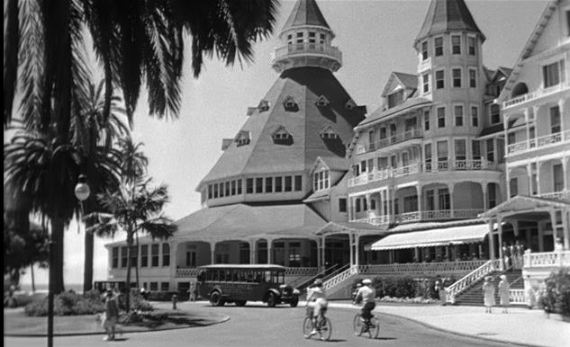 Thus endith the train scenes. Immediately after the emergency stop, the movie shows the band arriving at the “Seminole-Ritz Hotel”. Of course, that’s the famous Hotel Del Coronado near San Diego standing in for both the Seminole-Ritz and Florida.