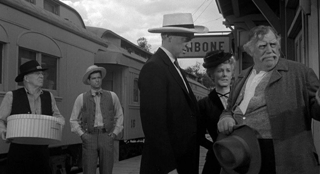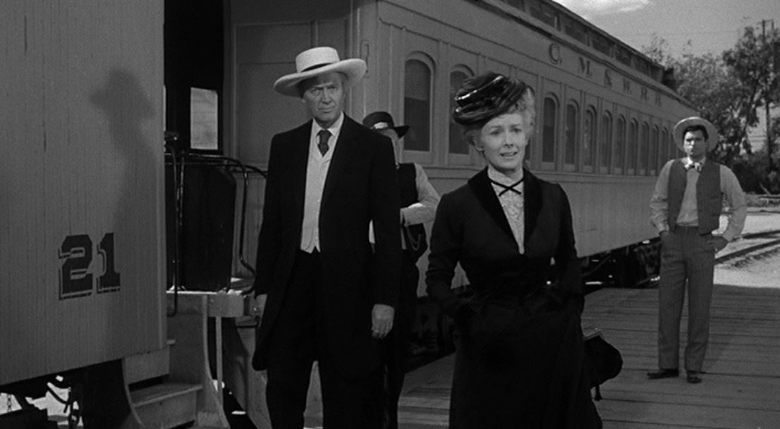 Jimmy Stewart (Ransom Stoddard) and Vera Miles (Hallie Stoddard) alight from the arch window coach #16, as cub newspaper reporter Charlie Hasbrouck (Joseph Hoover) in a straw boater looks on.