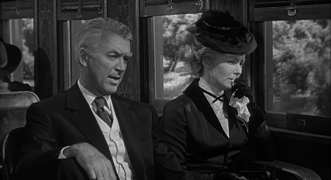 The subdued Senator and Mrs. Stoddard are riding back to Washington (just a studio set here). They decide to retire from life in Washington D.C. and move back to old Shinbone.