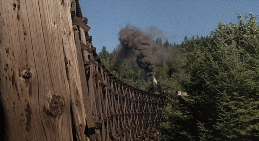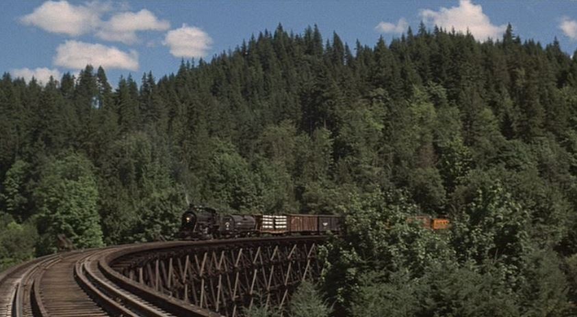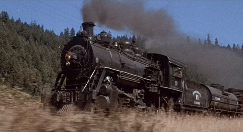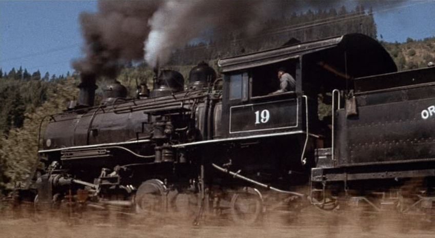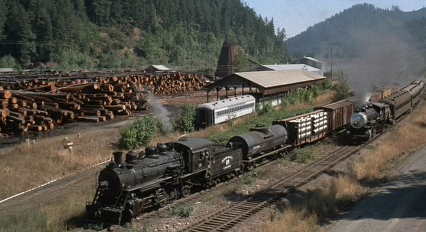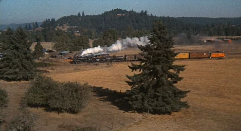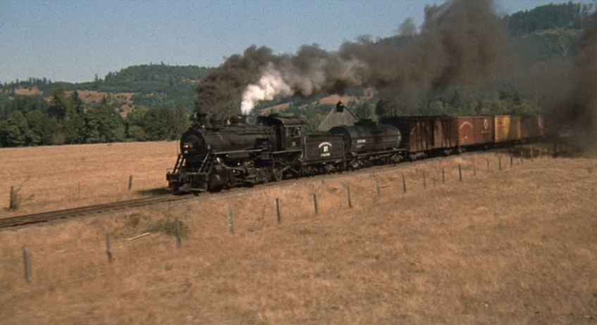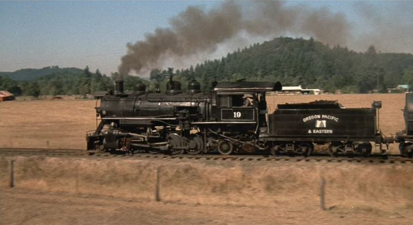 Filmed along the Oregon, Pacific & Eastern short line, this movie treats us to TWO operational steam locomotives pulling an eclectic mix of rolling stock past the cameras. The train scenes are sublime although the actors employed frequently go way over the top in the overacting department. Shatner-level carpet chewing. Anyway…