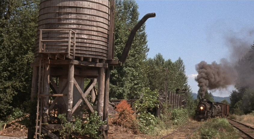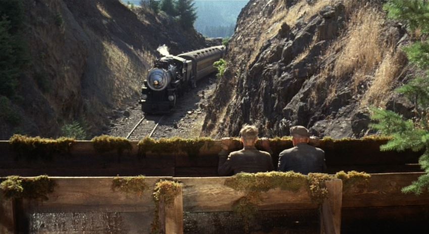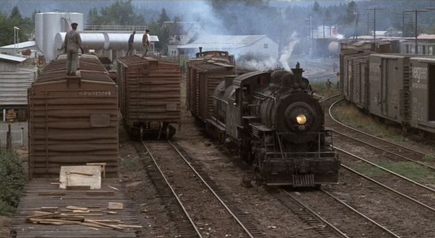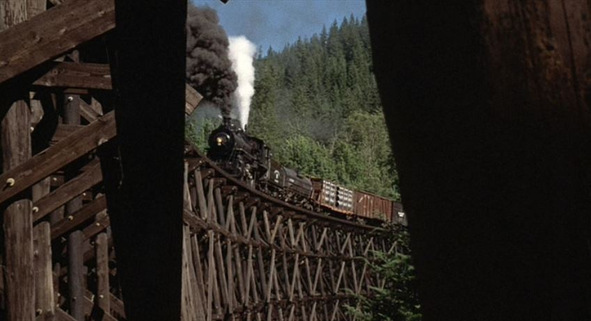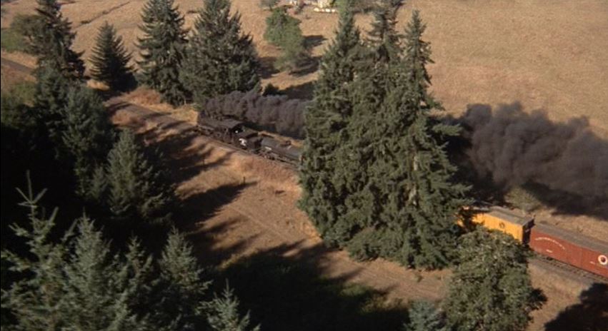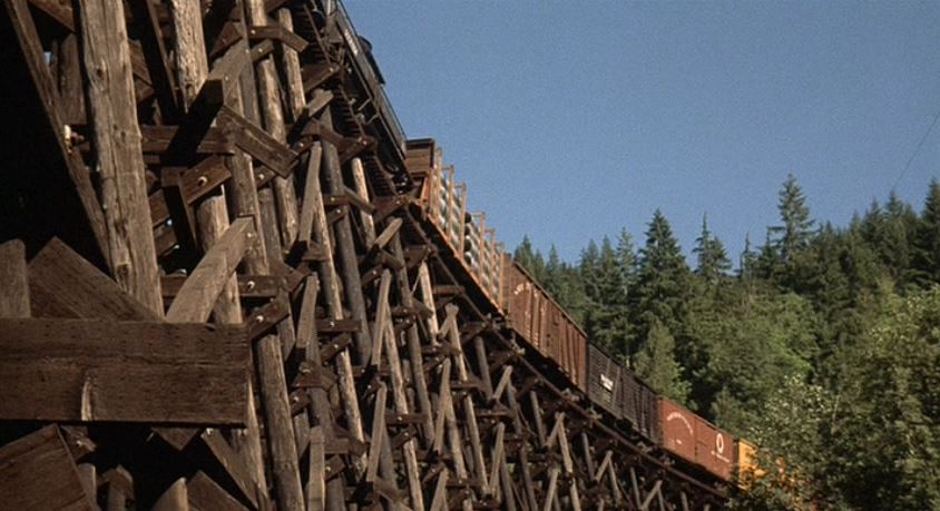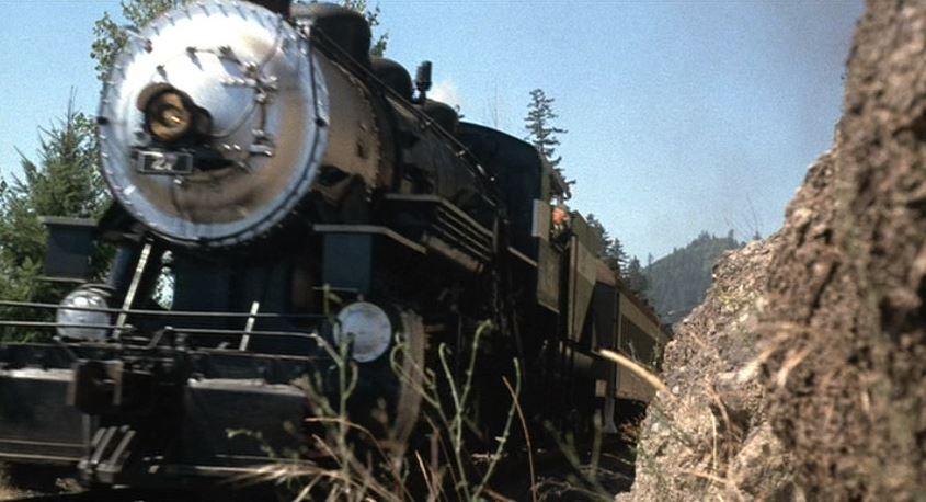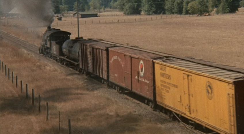 Filmed along the Oregon, Pacific & Eastern short line, this movie treats us to TWO operational steam locomotives pulling an eclectic mix of rolling stock past the cameras. The train scenes are sublime although the actors employed frequently go way over the top in the overacting department. Shatner-level carpet chewing. Anyway…
