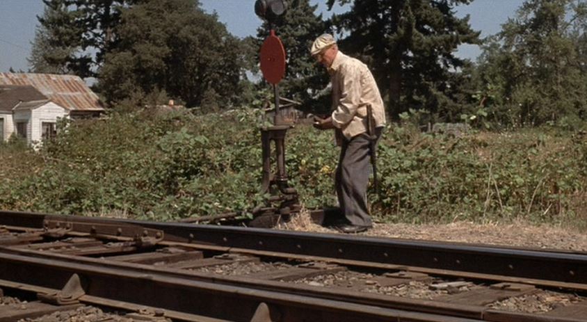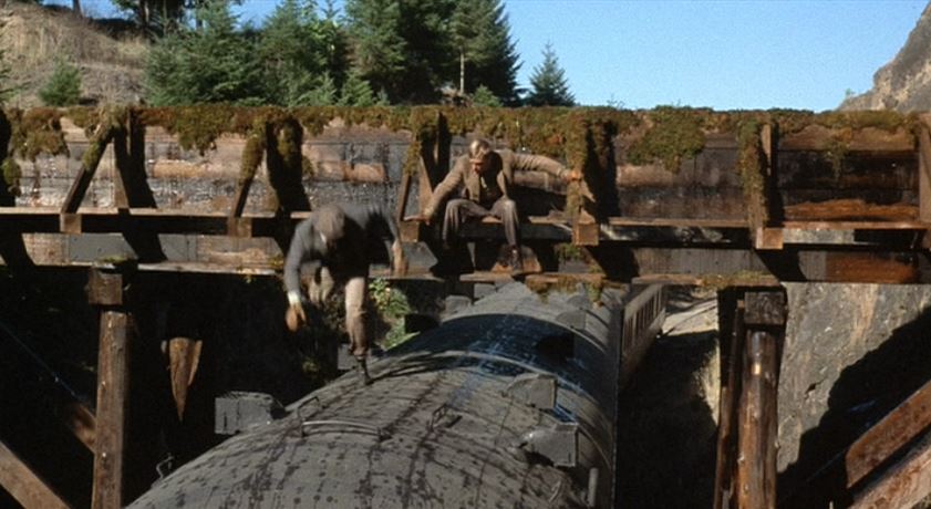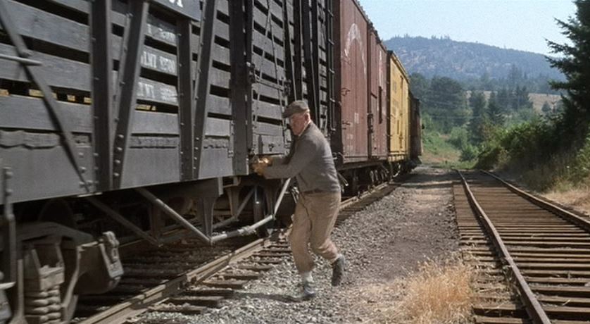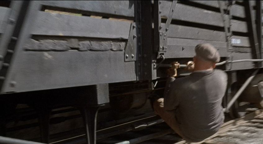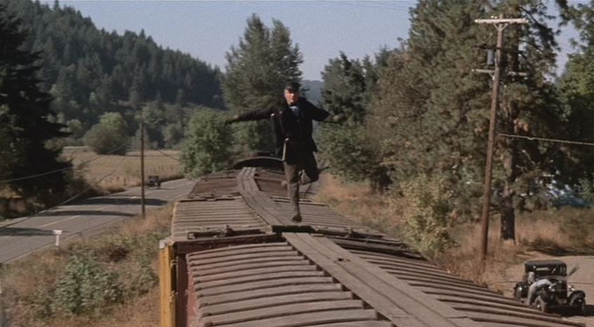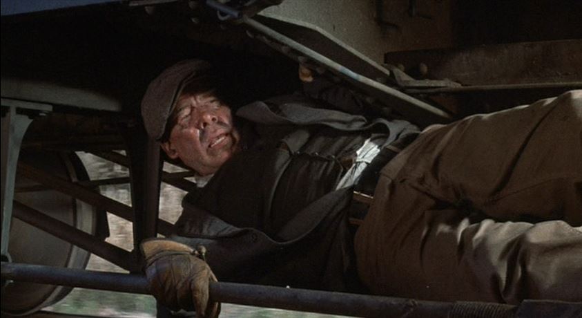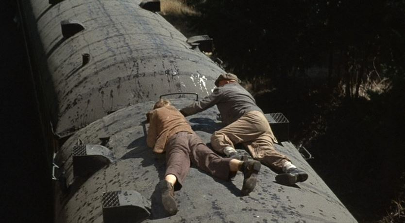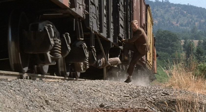 Of course, if you’re gonna have a movie about hobos, you’ve gotta have at least one scene of them “riding the rods” (structural bracing underneath the cars). Here we see Marvin hopping aboard…and later on Carradine takes a whack at it.