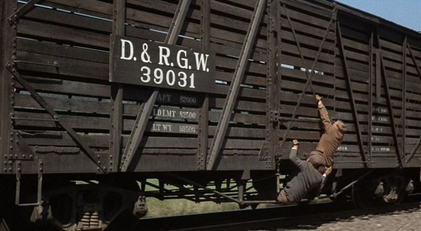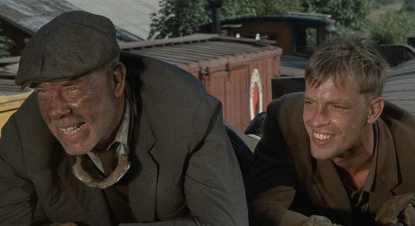 BUT….Borgnine is on to them and despite the hobos climbing the side of their Denver & Rio Grande Western stock car, Ernie unceremoniously ejects them from the train.