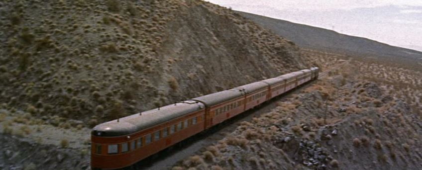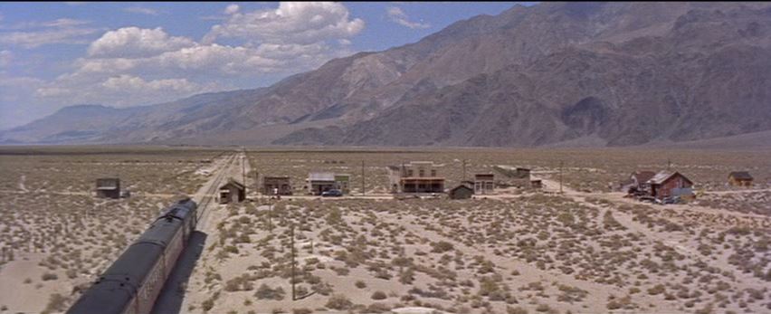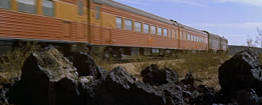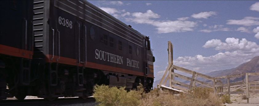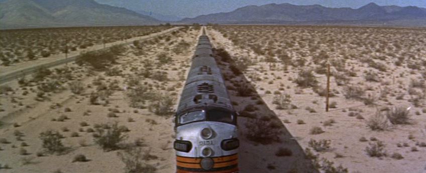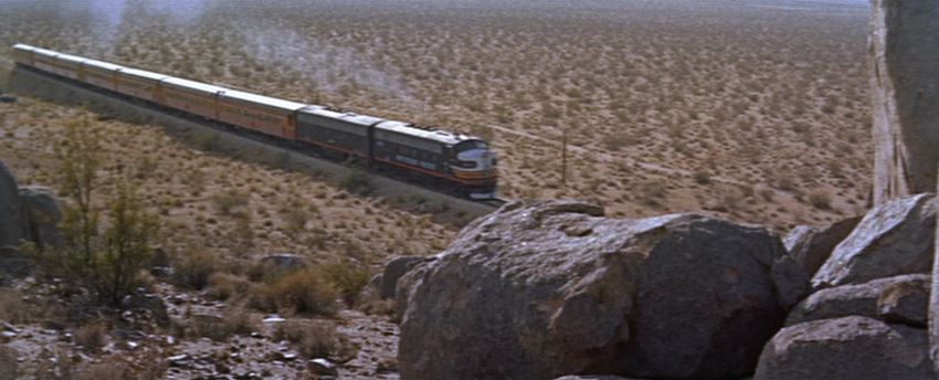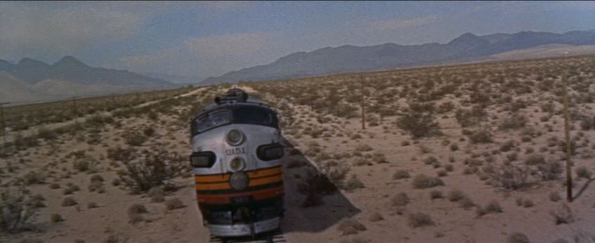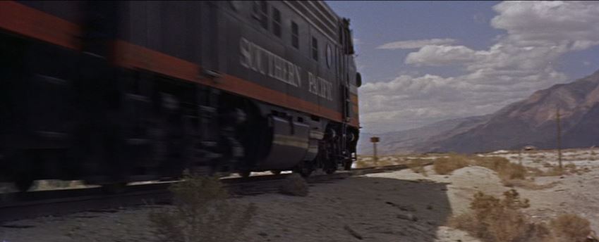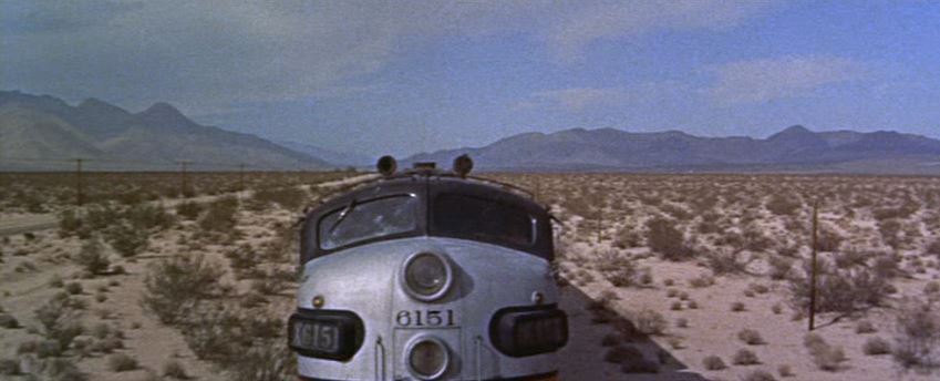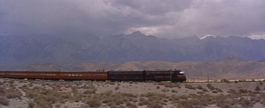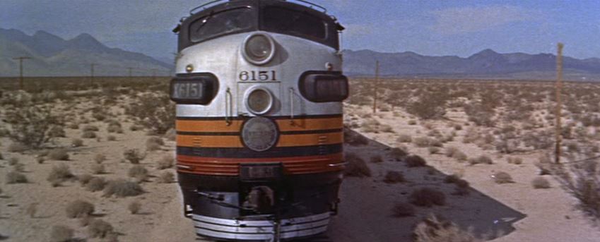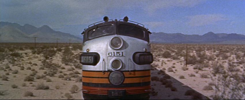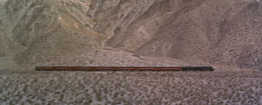 The picture begins with a distant shot of the train against the vastness of the California desert. Suddenly, the train is rocketing towards us at a crazy angle.