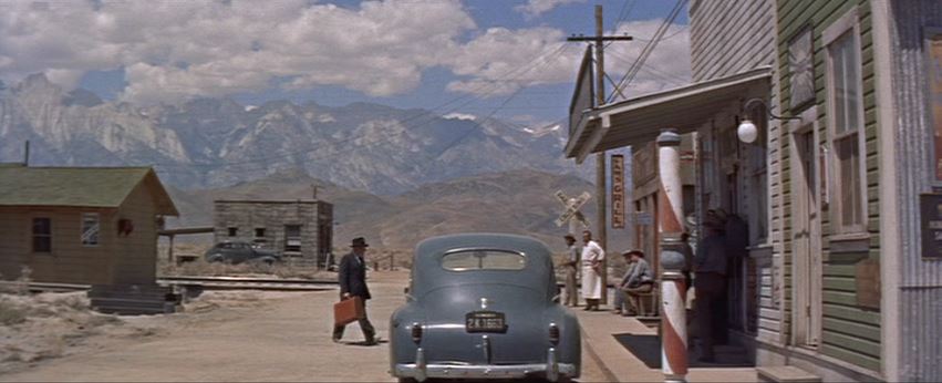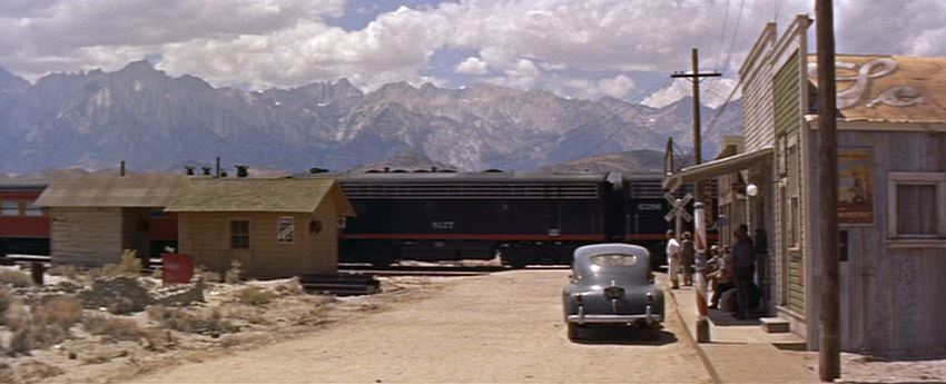 Overhead shot of “Black Rock” as the train approaches. The entire town was built as a set about a mile north of Lone Pine, CA. As the camera looks down the street, we get a clear view of the locomotive numbers. The cabless unit is SP #8127, an EMD F7B. The colorful consist comes to a stop at the little depot.