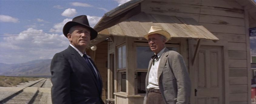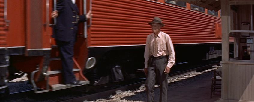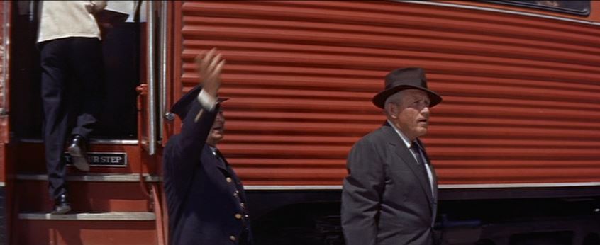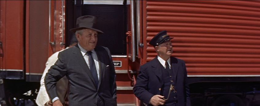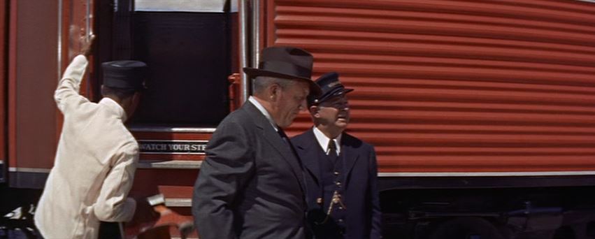 It’s Spencer Tracy!! Assisted down the steps by the porter, Spence has a look around. The porter climbs the steps with step-box in hand as the conductor waves a highball.