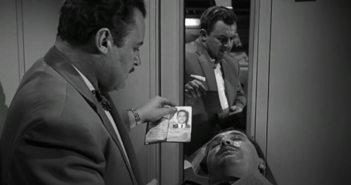 By sheerest coincidence, a gentleman from south of the border, Paul Scarff (played by Bill Nagy) has been badgering Steiger to have a drink with him. Scheming cad that he is, Steiger now laughs at Scarff’s bad jokes and takes him up on that drink. Slipping into his attached bathroom, Steiger fixes him a mickey. Cheers!