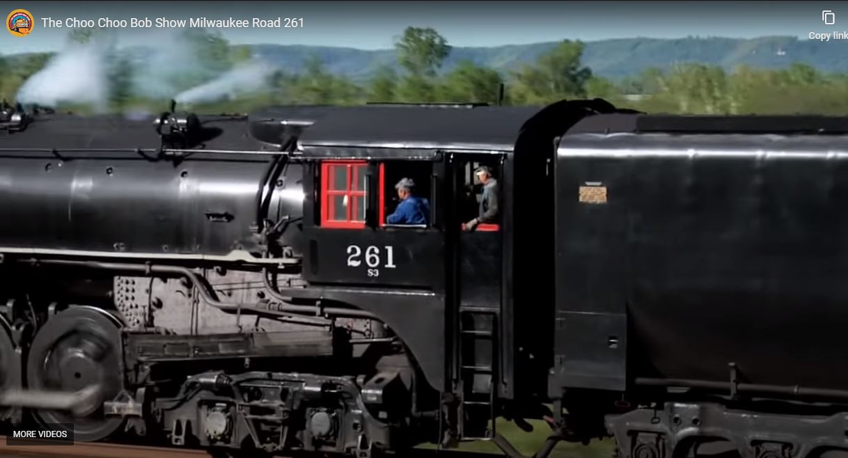 Milwaukee Road S3 class 4-8-4 #261 (built by Alco – Schenectady in July 1944) gallops along at track speed whilst back in the Skytop, Bob and Paul enjoy the view. Friends of 261 operates and maintains this Minneapolis-based locomotive and train.