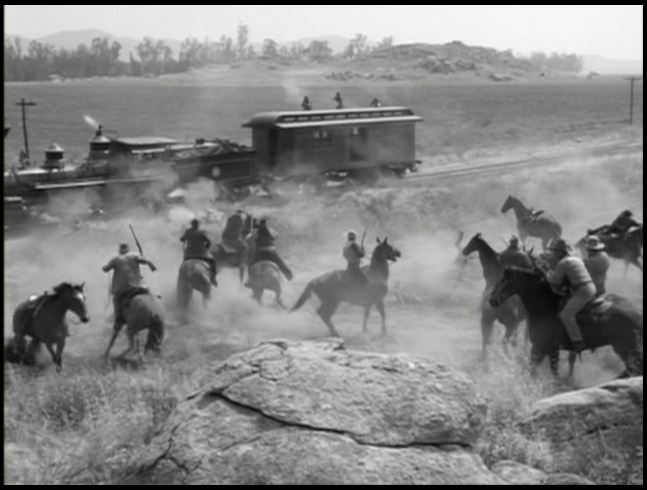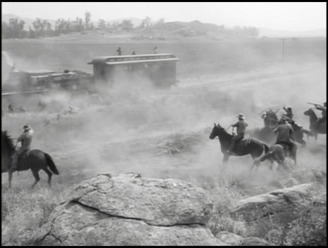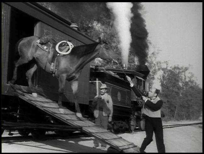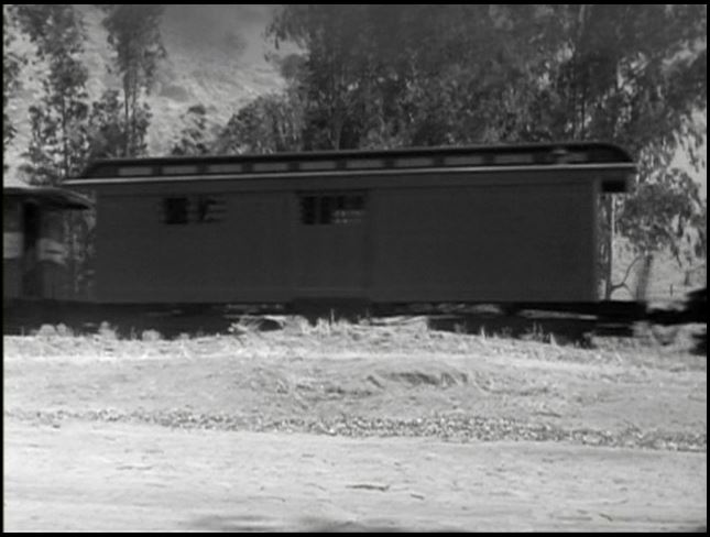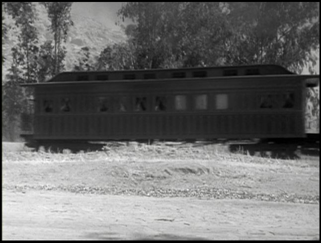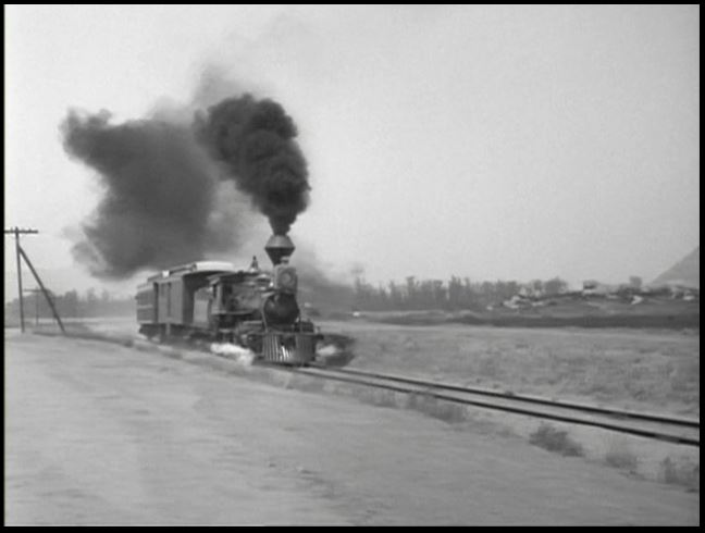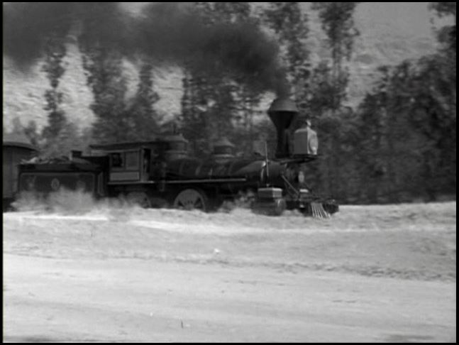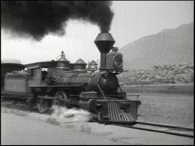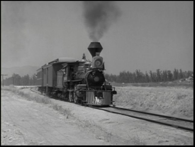 Motive power for the train was provided by venerable Virginia & Truckee 4-4-0 #22, “The Inyo”. This is from the days when she was owned by Paramount Studios. All exterior train shots were filmed around Menifee, California.