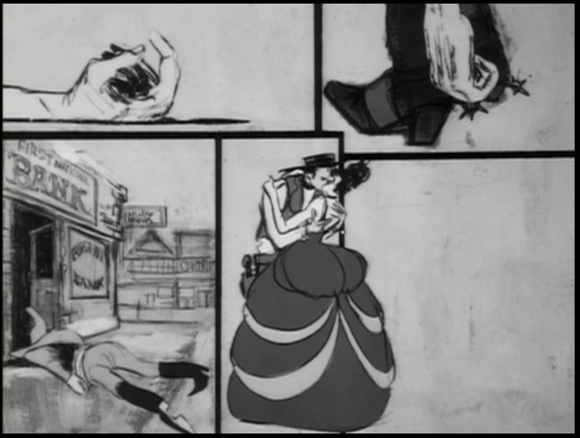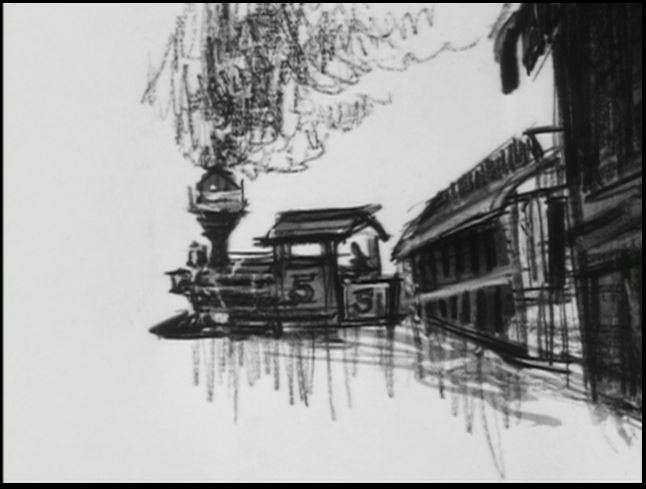Compare B&W and color poses of Inyo, a baggage car and Wanderer as they pause for Jim and Artemus to leap into action!