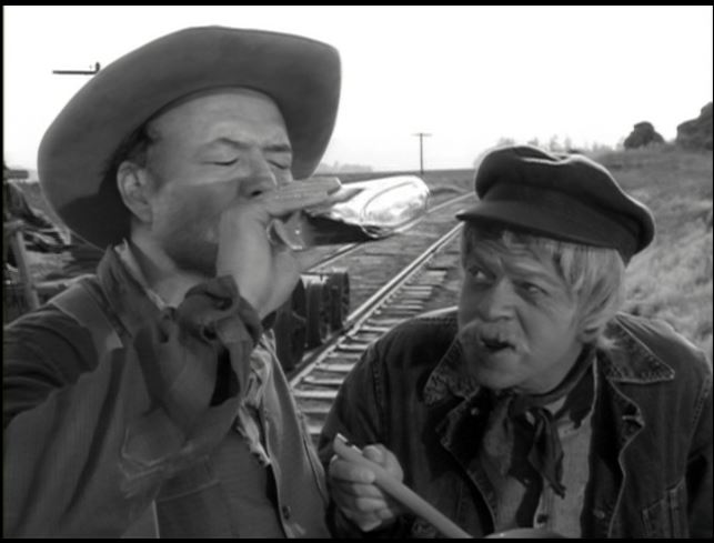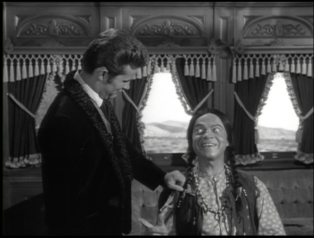 As a worker takes a belt, Artemus babbles authentic frontier gibberish. Artie is down on the railroad construction site snooping around.
