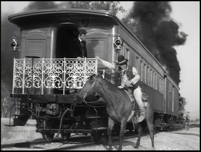 In this episode, the boys enjoyed the services of a snooty butler. Here he is unloading a horse for Artemus. Look at that fancy back railing on Wanderer 1. Also notice the 8 painted on the tender of Inyo. This was so film could be reversed to show the train traveling in the opposite direction.