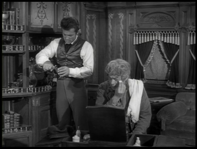 As Artemus puts on another disguise, Jim pours Sheila (played by Katharine Ross) a drink.