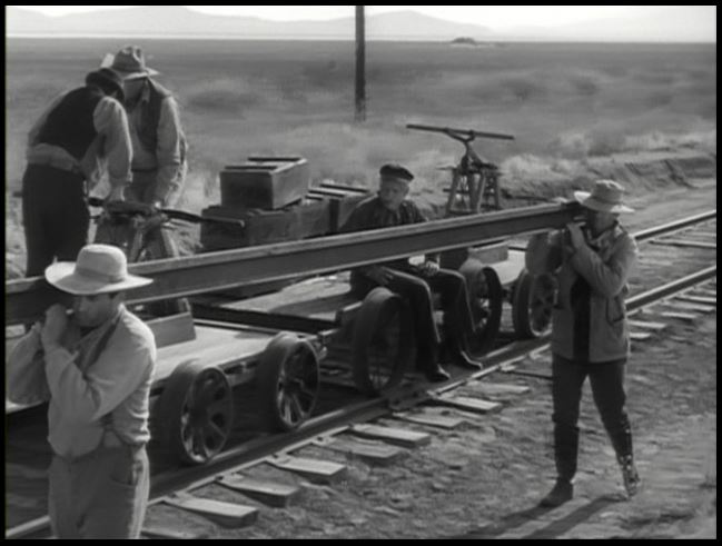 Uh…hold on. Just TWO guys carrying that rail? Assuming a 60lb rail (per yard), that’s 20 pounds a foot times a 39 foot rail section, or 780 pounds they’re carrying on their broad shoulders!