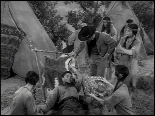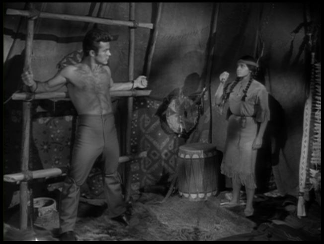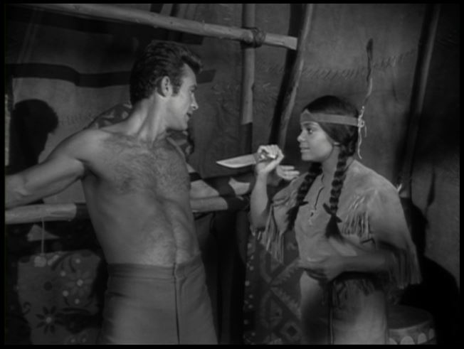 Cheesecake interlude! Anyways, Jim and Artie are soon captured and brought to an Indian camp. Jim and his tight pants are tied to some sort of scaffolding as Little Willow, Rahr-RAHR! (played by Susan Silo) comes after him with a big knife. Of course, Jim gets the girl as they engage in a little bondage smooching.