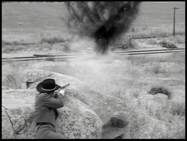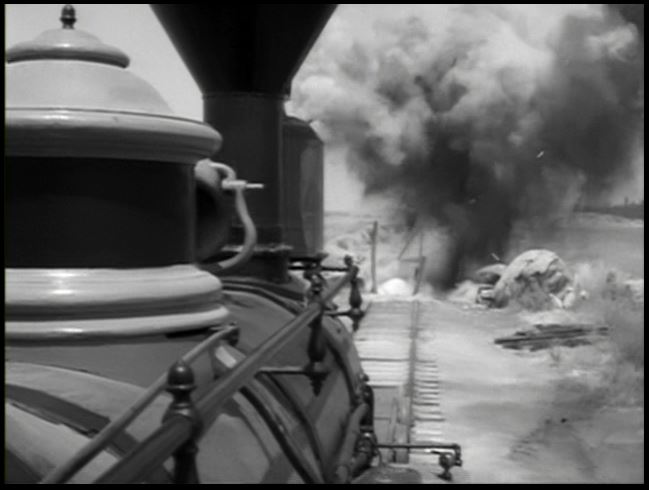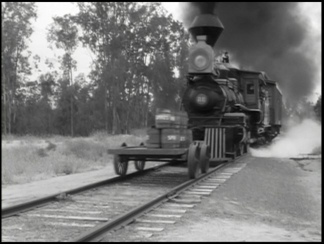 V&T #22 pushes the “bait” along — but the crooks have placed boxes of dynamite (you KNEW dynamite would be involved) next to the tracks — which a henchman proceeds to blow up with a rifle shot — to stop the train.