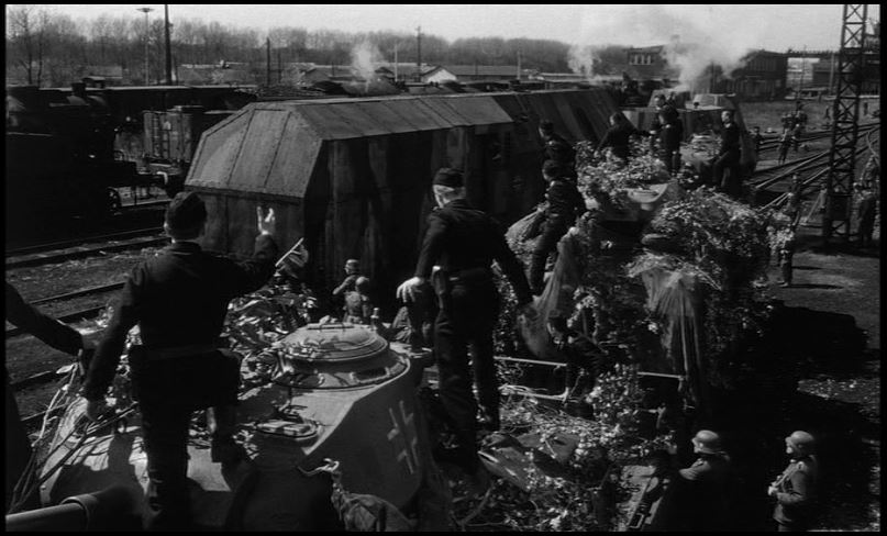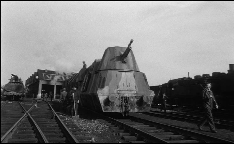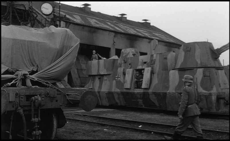 As Labiche watches from the switch tower, an armored locomotive (complete with canon and ack-ack guns) emerges to pull the military train.