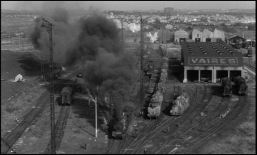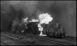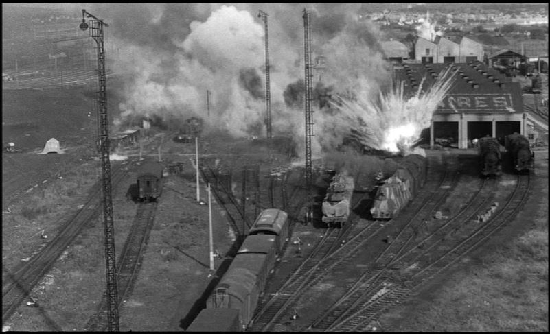 What an air raid! The art train barely snakes out of harm’s way before the entire area is reduced to rubble. Impressive aerial views and scenes with the switch tower blowing up and the derailed armored locomotive set on fire.