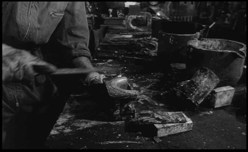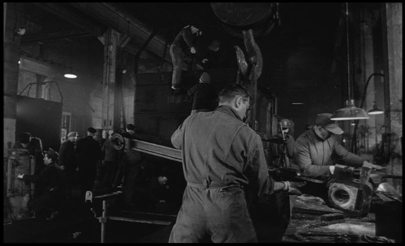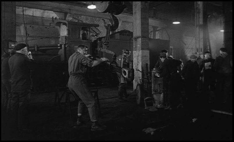 In a really cool railroad shop sequence, we see Labiche repairing the damaged bearing, then moving the entire driving rod over to the steam engine with a crane.