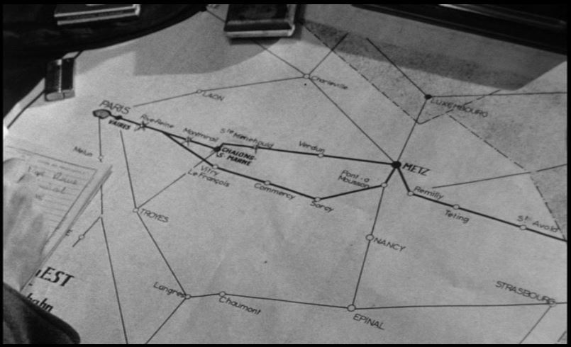 Finally, the art train reaches Zweibrucken, just inside the Third Reich and the officer smugly calls it in. Except the train is actually at Vitry Le Francois heading west back to Rive-Reine!