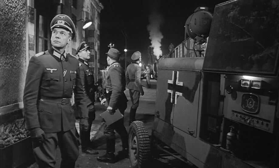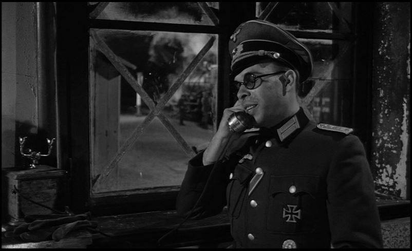 What luck! A German convoy on the adjacent road has Von Waldheim commandeering their transport and unloading his paintings. When the convoy boss tells him, “No way, Jose”, Colonel Franz flips out and gets the Dutch Angle villain treatment as frequently seen in “Batman“.