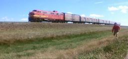 Our first train scene is 28 minutes into the movie. Substituting for Kansas are the prairies just outside Calgary, Alberta.