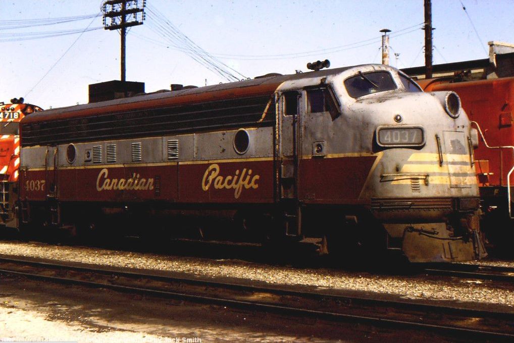 For comparison, here’s a picture of CP 4037 GMD FP7A in its original maroon/grey script-lettering taken just before filming started. Courtesy RRPictureArchives.net: Date: 4/11/1977, Location: London, ON CA, Collection Of Jack Smith.