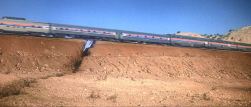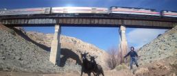 Here comes the Southwest Limited! Led by three Amtrak SDP40F locomotives running elephant style, the train crosses a dry wash on a high bridge.
