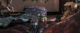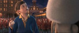 With the Polar Express and about a million elves for an impressive backdrop, Hero Boy finally meets Jolly Old Saint Nick. Notice H-Boy is clutching a key plot device (sleigh bell that came off a reindeer).