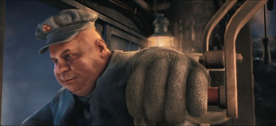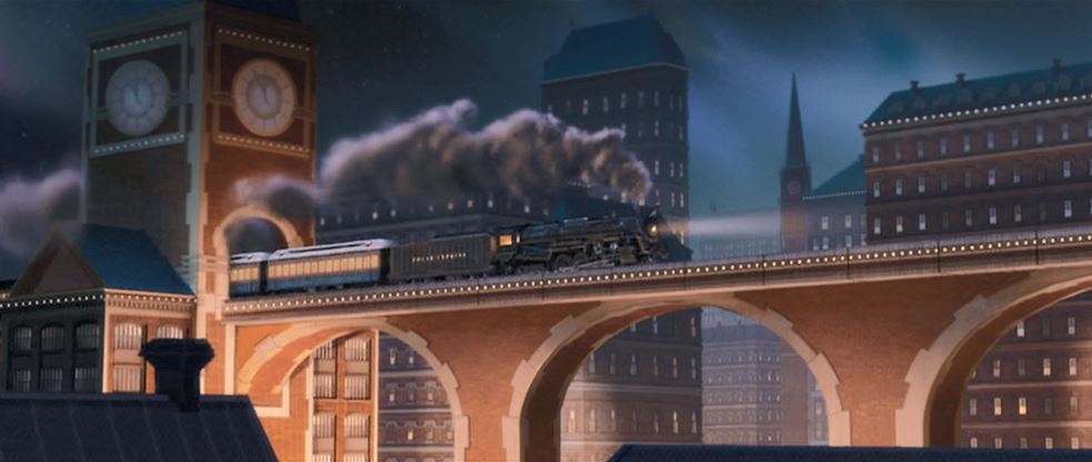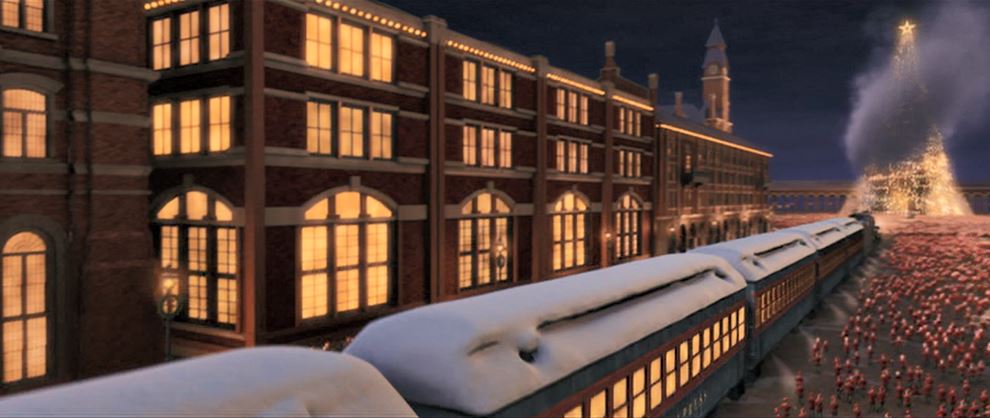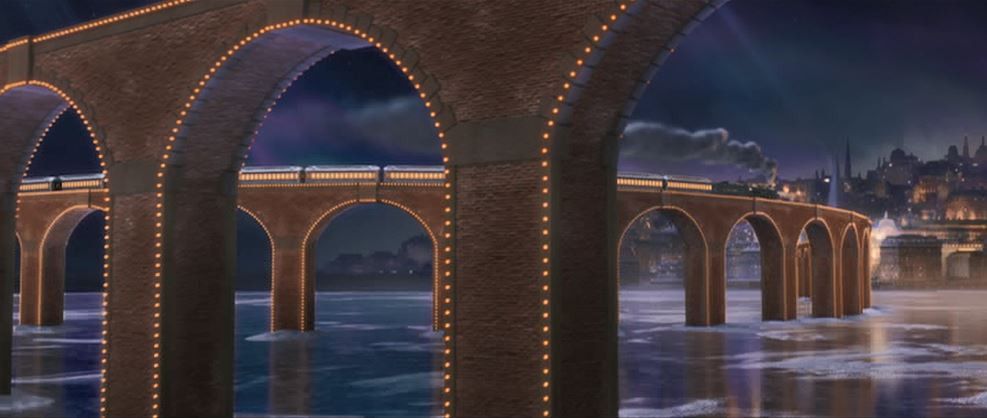 Our Christmas train pulls into the North Pole across an impressive viaduct. According to IMDb Trivia, animators based the buildings on the old Pullman plant buildings and factory clock tower.