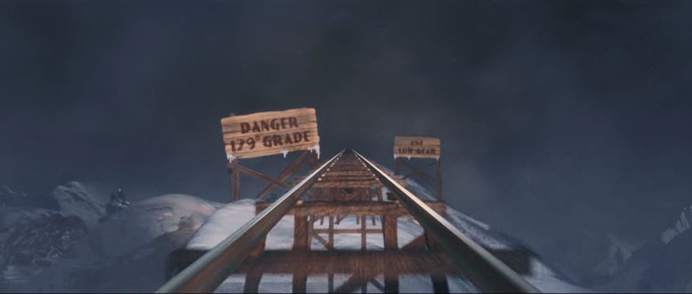 In a nod to all those Looney Tunes cartoons from the days of yore, the train is confronted with two preposterous signs: “Danger 179 degree grade” and “Use Low Gear”.