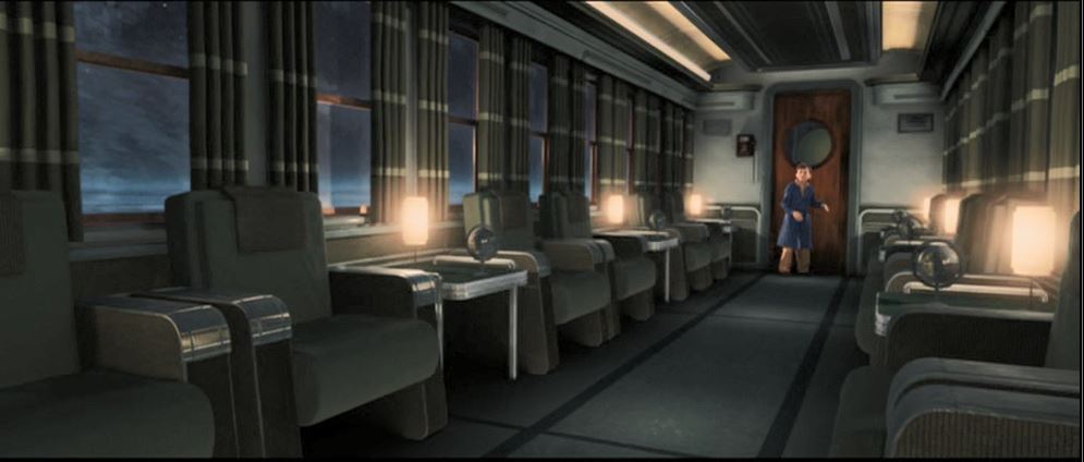 “Climb aboard…we’re expecting yoooooouuu….“. Here’s our first view of the car interior half filled with pajama and bathrobe-clad kids. I dig the circular window on each coach door.