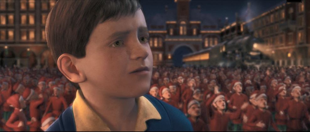 With the Polar Express and about a million elves for an impressive backdrop, Hero Boy finally meets Jolly Old Saint Nick. Notice H-Boy is clutching a key plot device (sleigh bell that came off a reindeer).