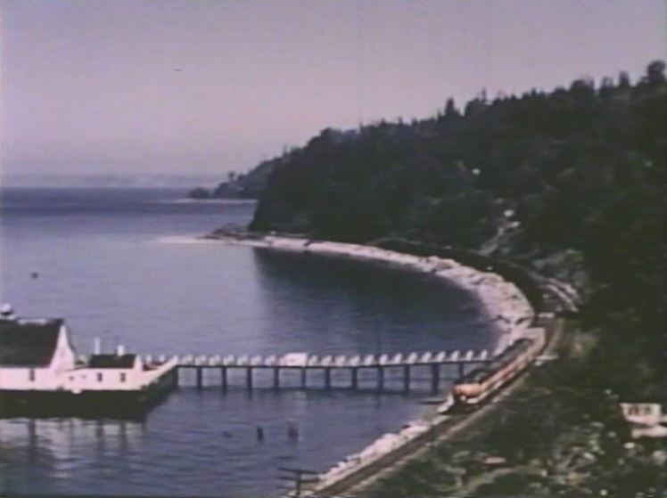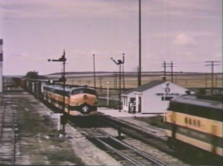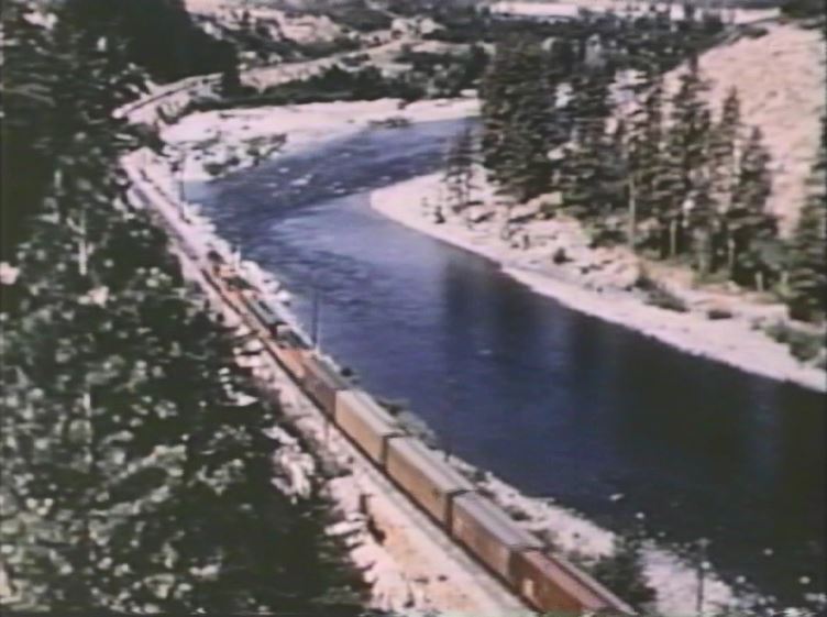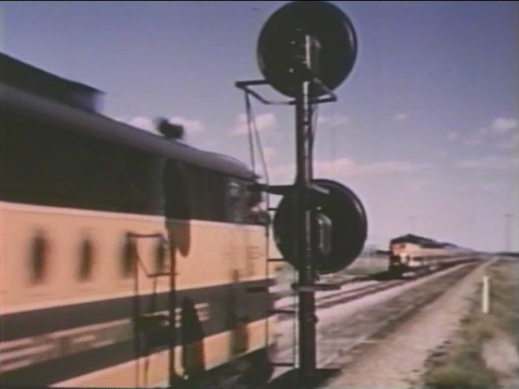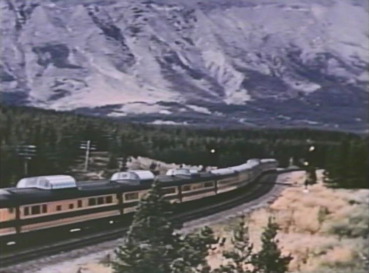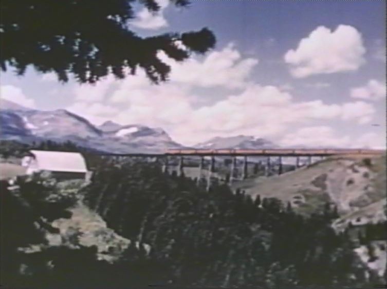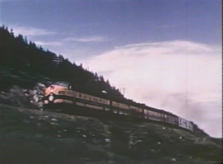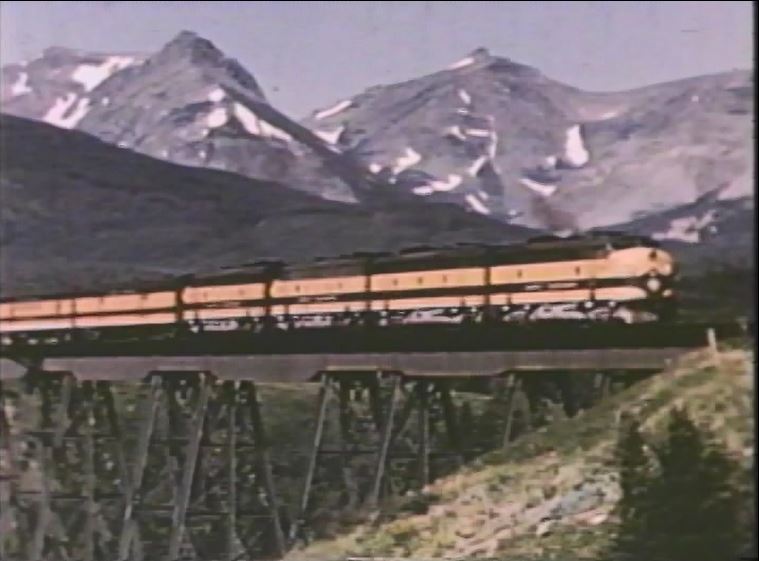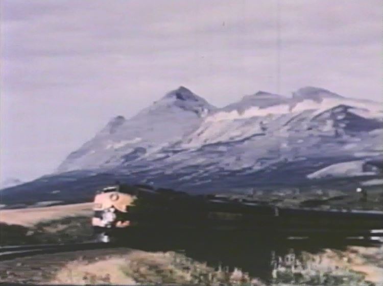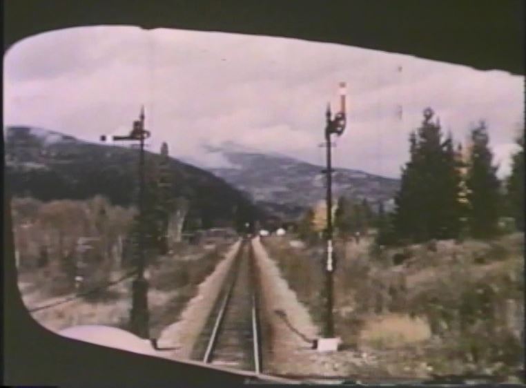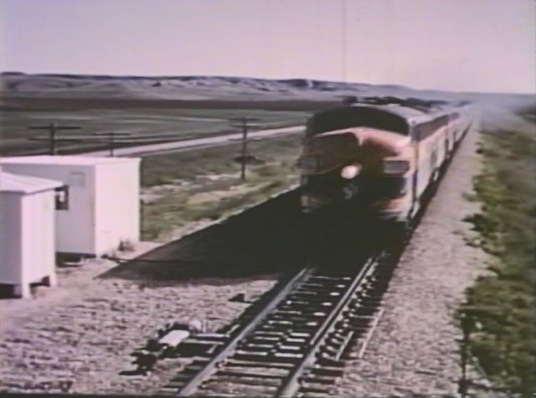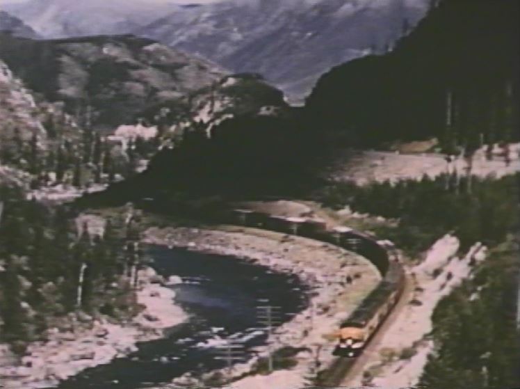 The Empire Builder is about to drop a semaphore signal somewhere in the Montana Rockies. Note the 3 short Great Dome coaches and 1 large Great Dome lounge car which helps date the film after late 1955.
