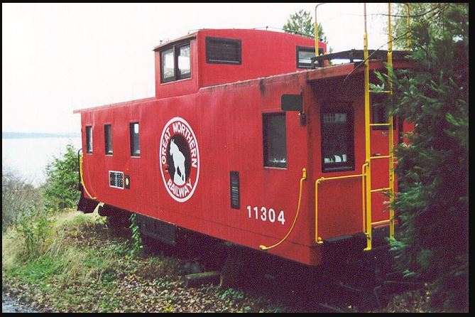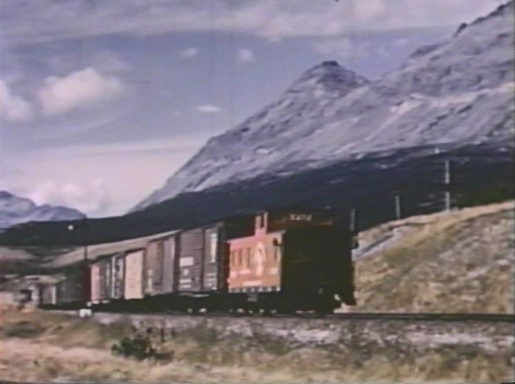 While in Glacier territory, filmmakers caught caboose X-278 of train #401 passing a spectacular stand of mountains. Sister caboose X-277 is still around (as of 2001) and residing on Bainbridge Island, Washington.