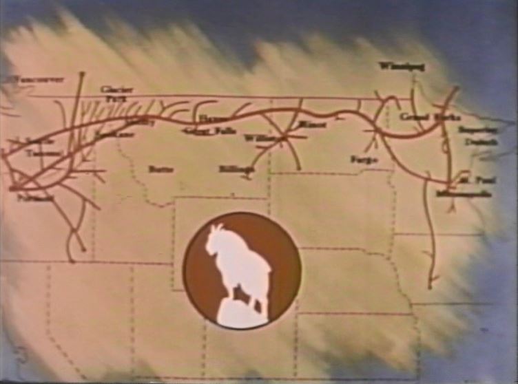The map is correct, but the ROUTE of the GN Ry. is printed BACKWARDS! IOW, the lines around Spokane, Seattle, Portland, Vancouver have been plunked down where Winnipeg, Grand Forks, Fargo and the Twin Cities are located. Somebody in Marketing really messed up. Nice logo though, aaaaand the credits roll.