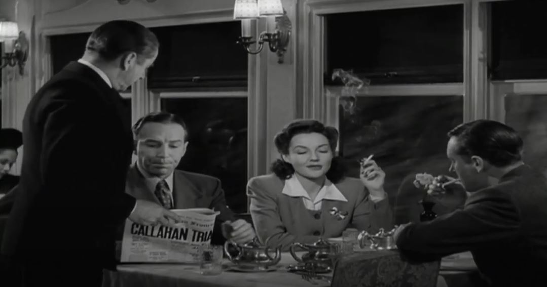 This is the widest dining car I’ve ever seen. Nice fixtures and accoutrements, though. Time for a late supper, Shayne finds himself seated with Kay and her fiancé. Three’s a Crowd! Afterwards, let’s have a coffee and a smoke while reading the San Francisco papers about the Callahan trial. Love the heavy silver teapot.