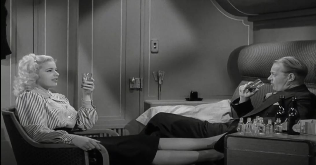 Va-va-Voom! Surprise witness Helen Carlson (played by Mary Beth Hughes) has been brought to her compartment on a stretcher wrapped in swaddling clothes as a brunette. Once she is alone, off comes the wig and blankets. Shayne stops by and reminds her to keep out of sight, lock her door and NO DRINKING on this trip. This does not sit well with the thirsty vixen.