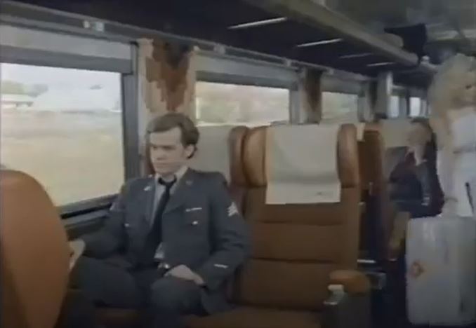 Two interior views. First, Michael Rangeloff (played by Michael O’Keefe) watches the passing scenery from his seat in a CP Dayliner coach; Second, Rangeloff and Standish Logan (played by Beverly D’Angelo) are tangled up on the stairs leading up into a CP Skyline dome car.