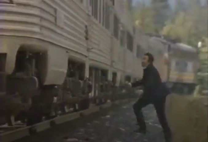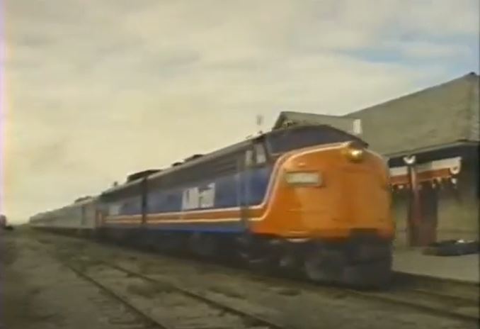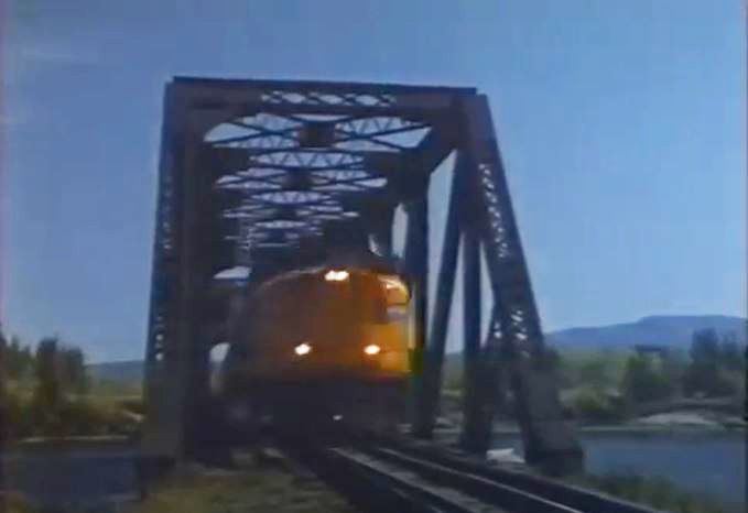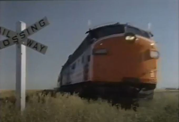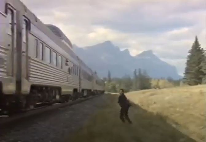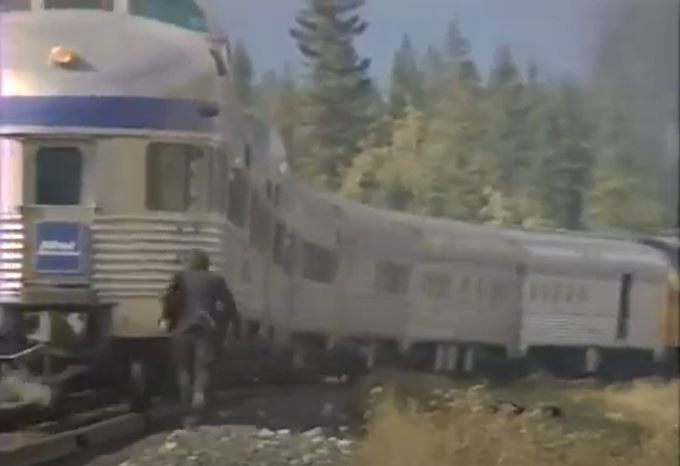 This movie was originally brought to my attention courtesy of Erik Stenberg (September 2019 email). It’s as obscure as a train movie can get, filmed out in the wilds of Alberta and British Columbia. Canadian locations meant we are treated to a wonderful Budd-built pocket streamliner of ex-Canadian Pacific cars pulled by a couple former-Canadian National, GMD FP9A diesels. All this glorious passenger equipment courtesy of VIA Rail Canada, who also whomped up a garish “AMrail” paint scheme for the F’s.