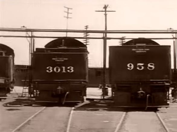 Farina (played by Allen Hoskins) and Wheezer (played by Bobby Hutchins) are riding the turntable and checking out some of the locomotives. I can’t identify #3013, but #958 is a 2-10-2 and #3147 is a 2-8-2 — all built by Baldwin.