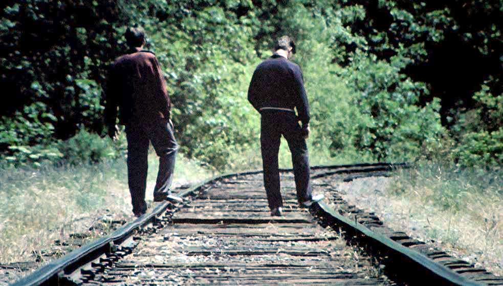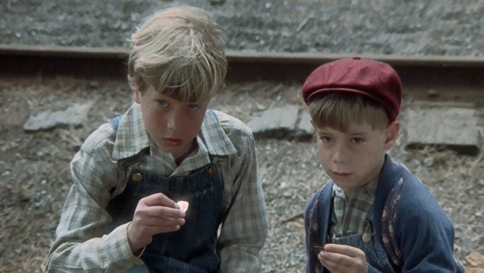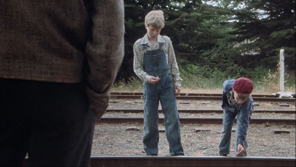 The small boys retrieve their flattened coppers and scamper off. The stoic Hopper ambles down the track as the camera pulls back. Love that derail post!