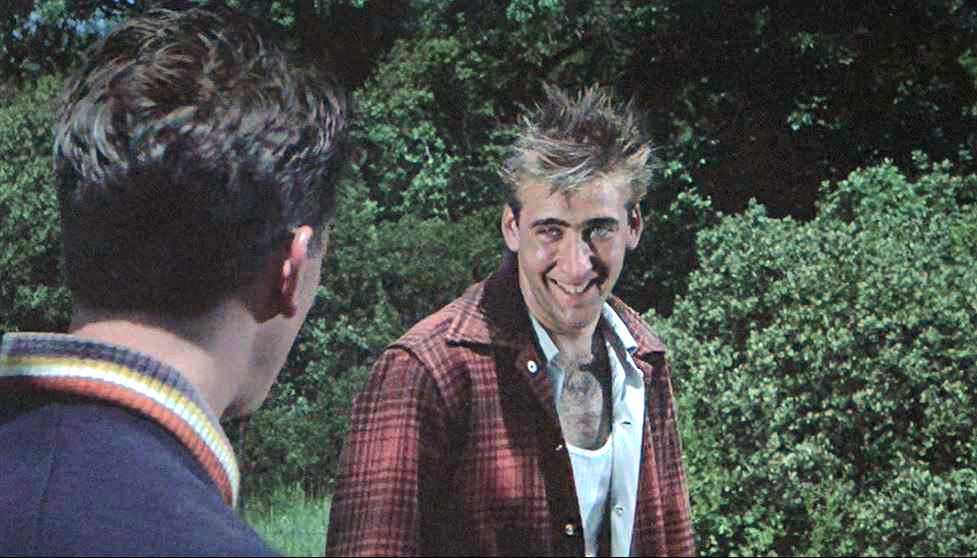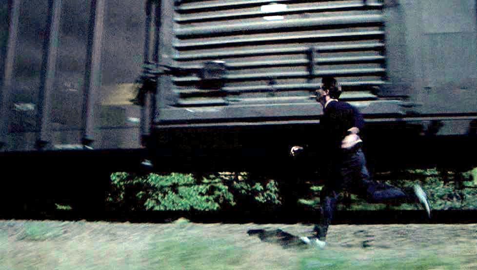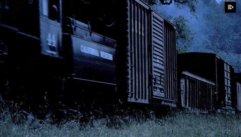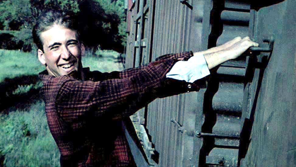 Impressive shot as the train rounds the bend. Looks like the same consist from the movie’s opening. Nick Cage makes a great face as he gets psyched up for the train hopping.
